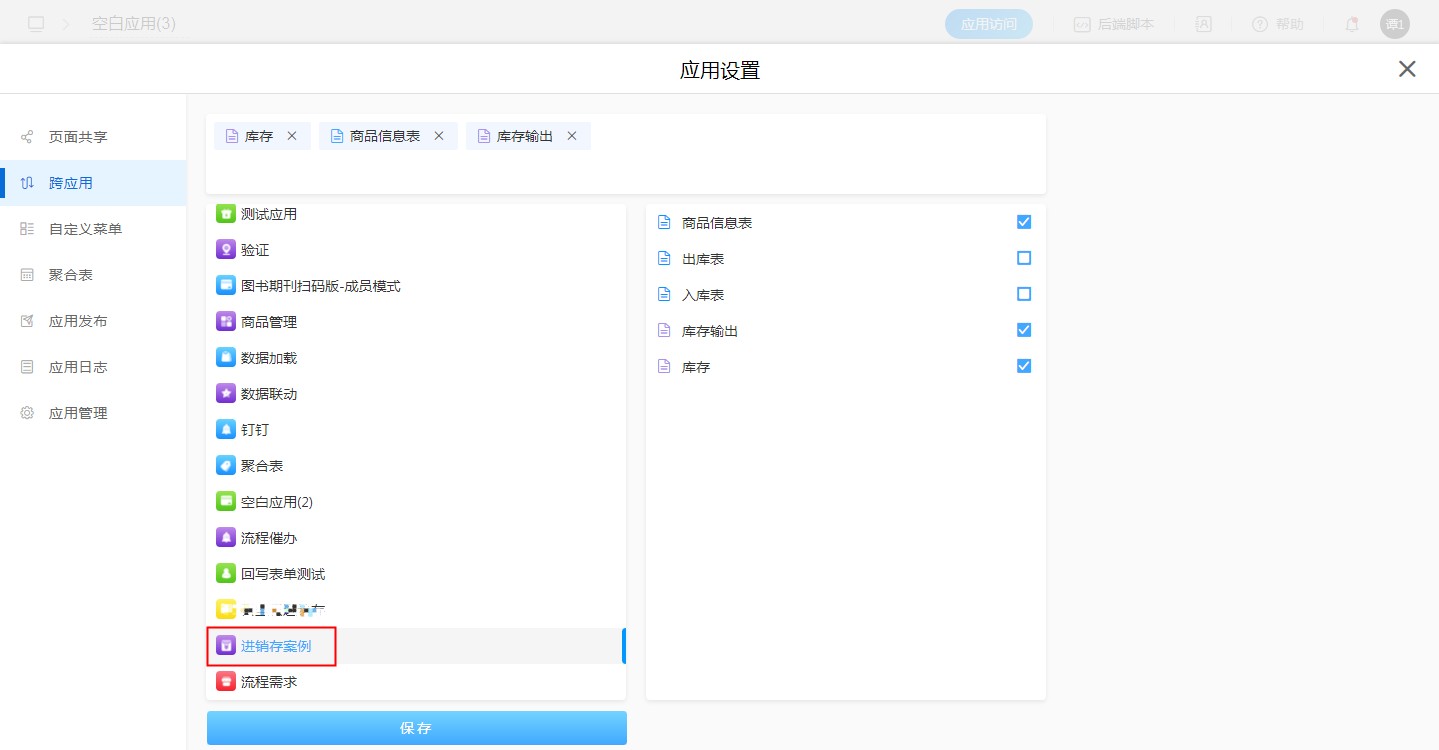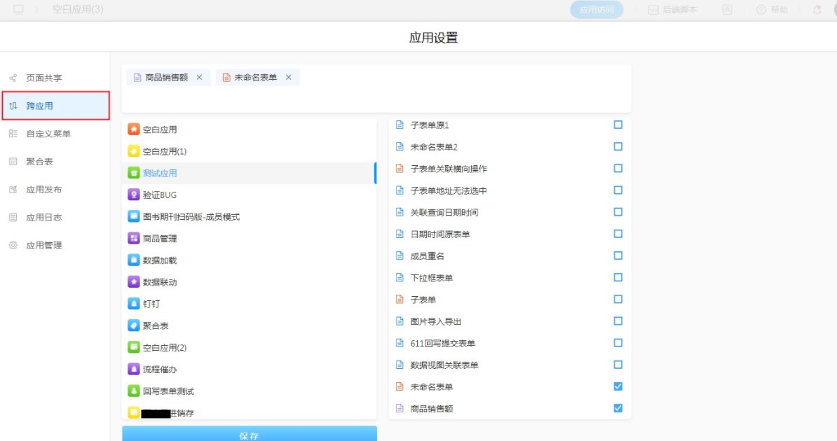 操作步骤:进入任意应用的【应用管理】-【应用设置】-【跨应用】,选择应用A的表单、聚合表、数据视图,保存。
