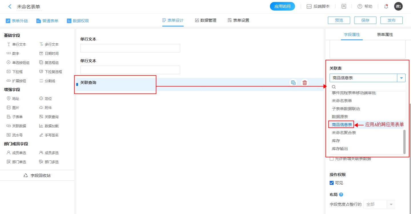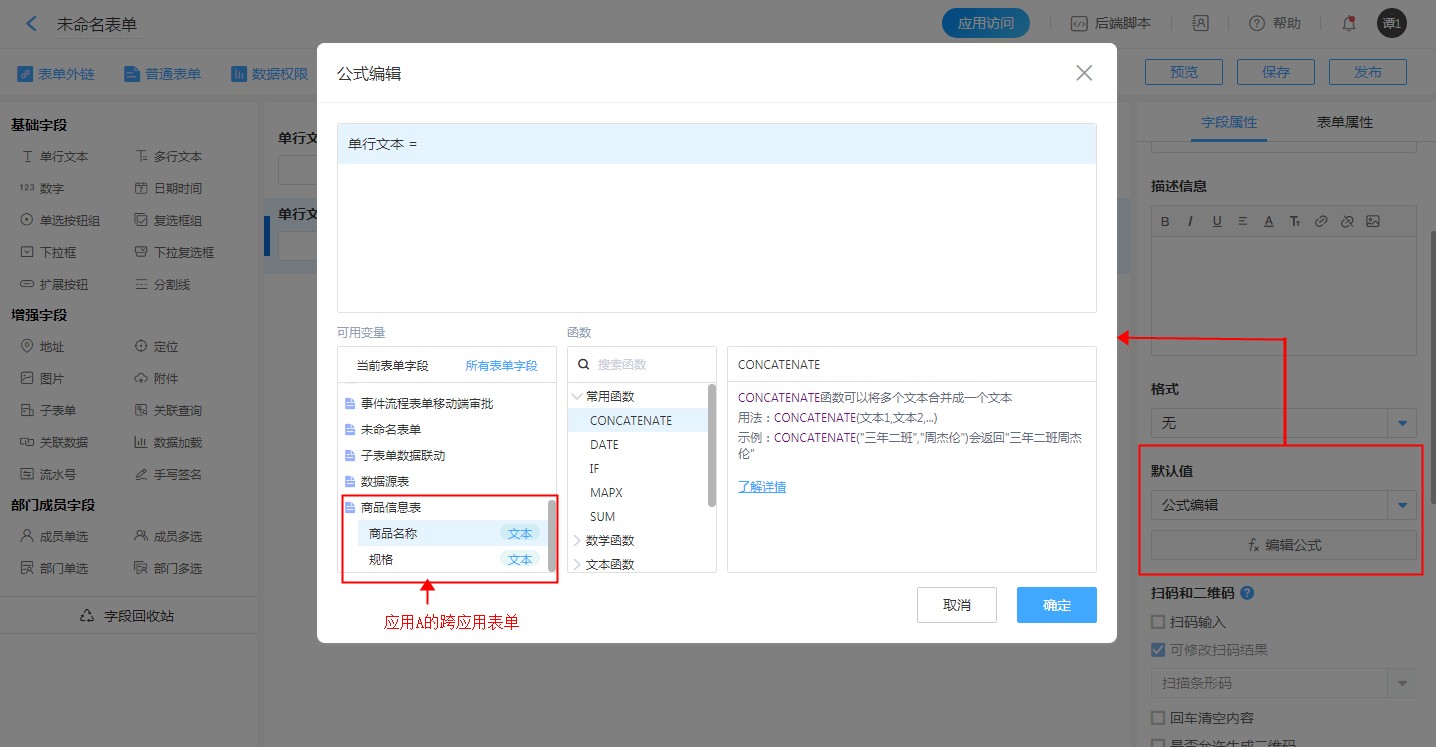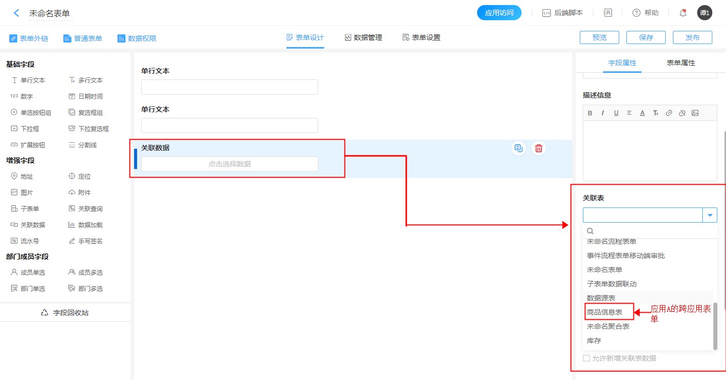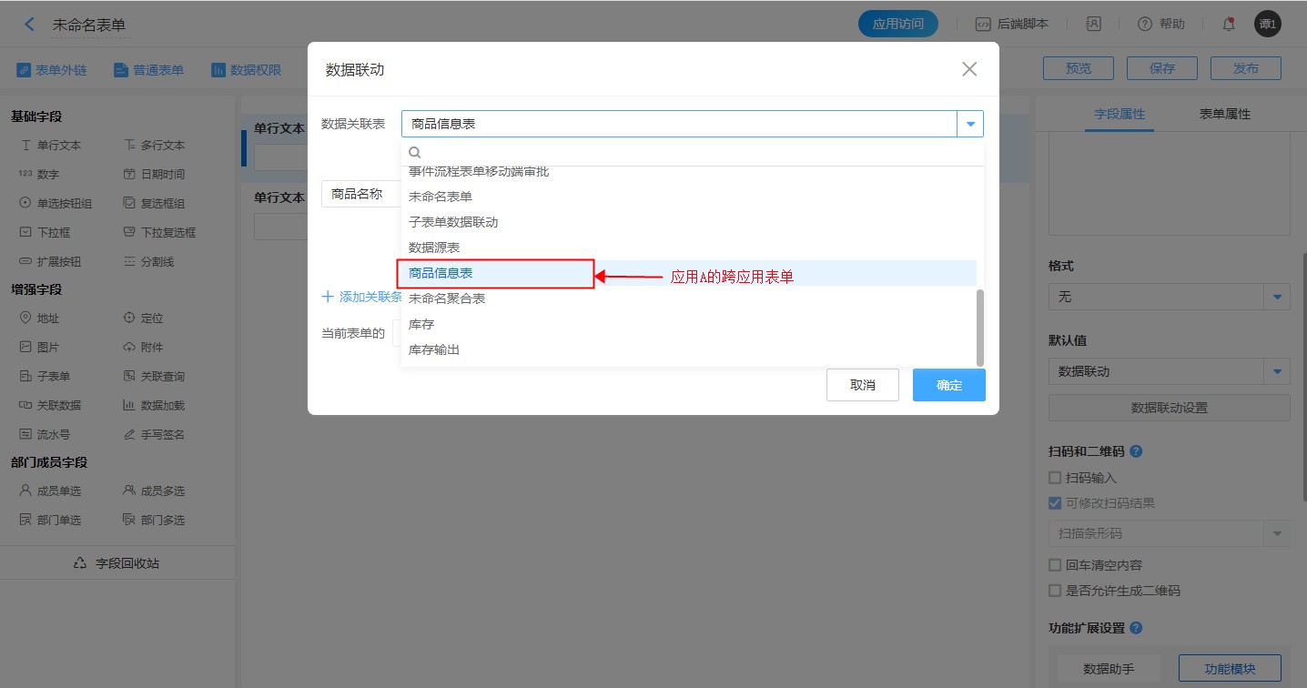 (3)表单中,数据联动、公式、关联查询、关联数据等功能均支持跨应用。