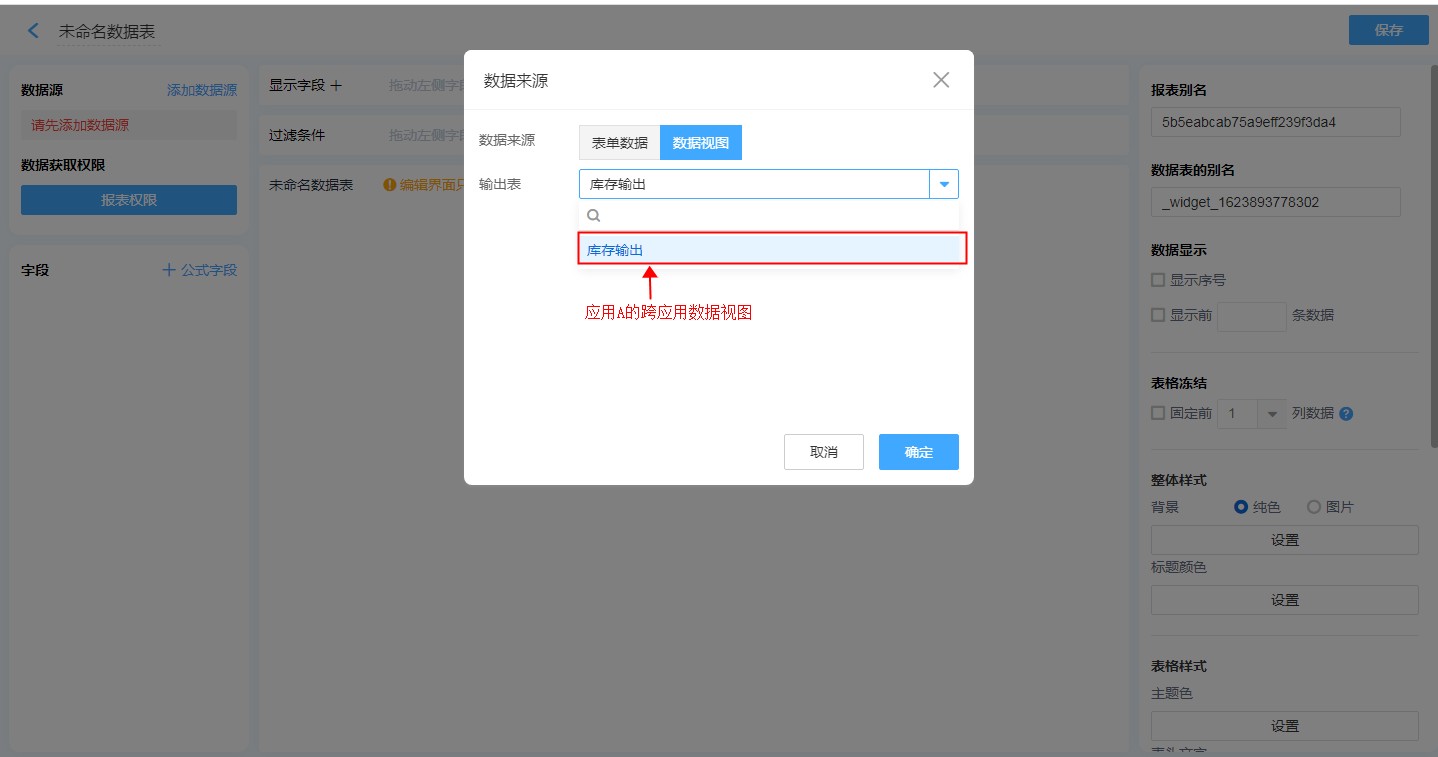 • 创建报表,数据源选择应用A的跨应用数据视图。