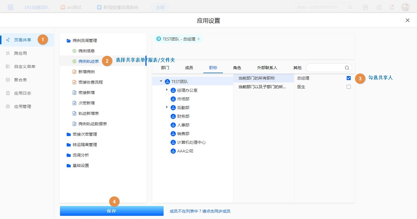 【应用访问】——【设置(页面左下角)】——【页面共享】——【选择文件夹/表单/报表,并勾选相应的部门/角色/成员/其他】