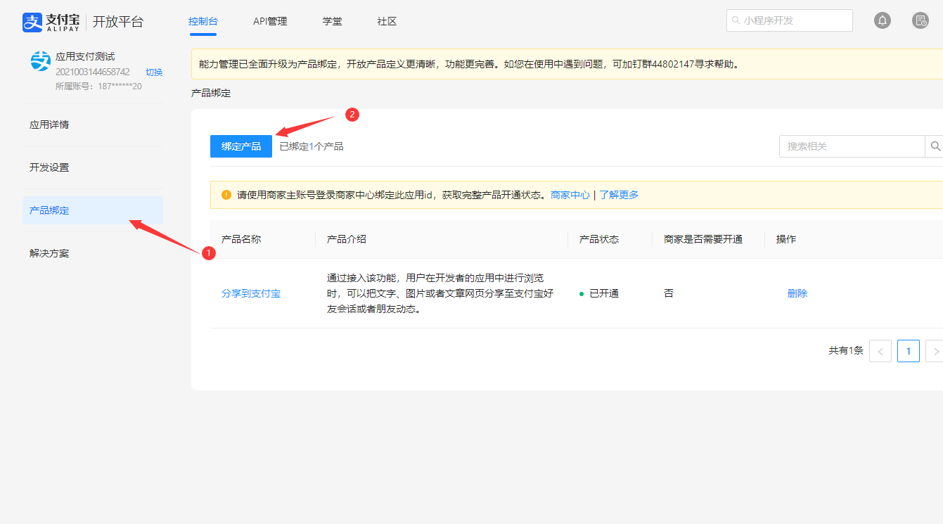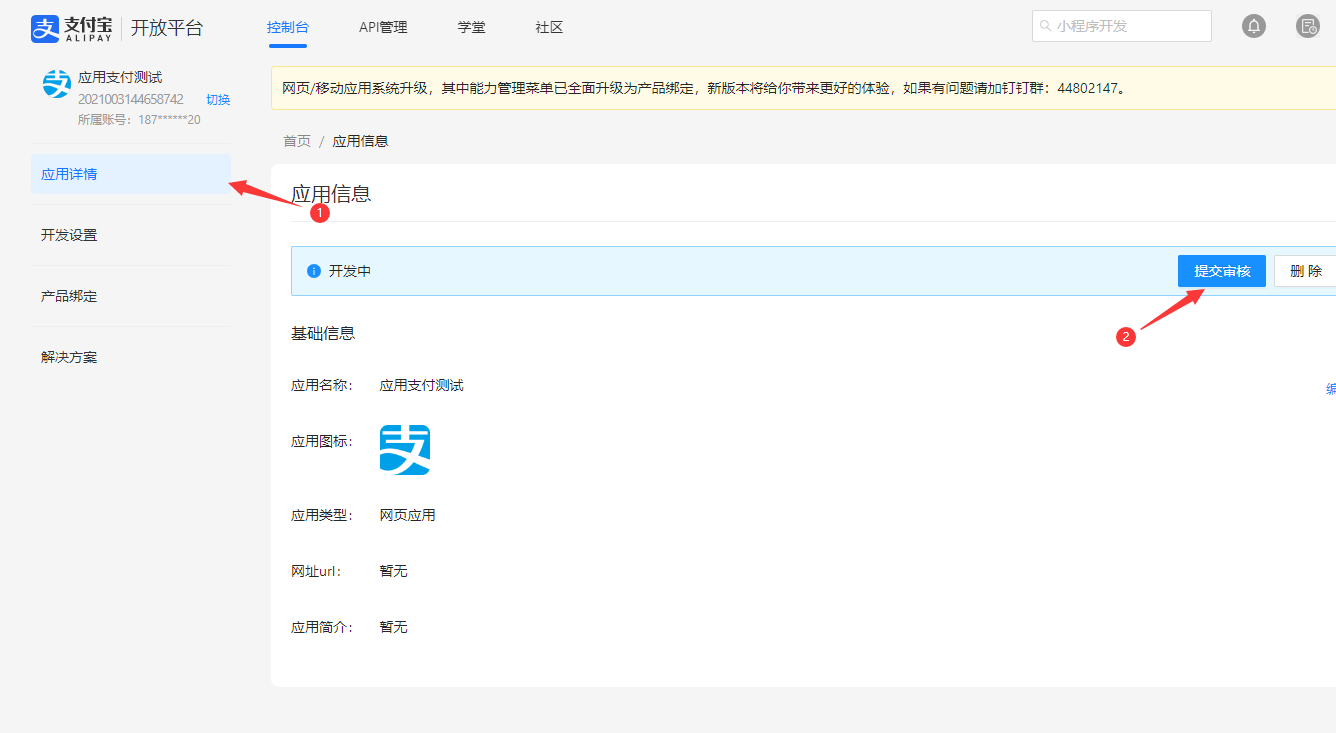 2.1、登录支付宝开放平台,选择创建网页/移动应用,创建应用后复制应用ID保存好(ID在应用详情页左上角应用名称下面)