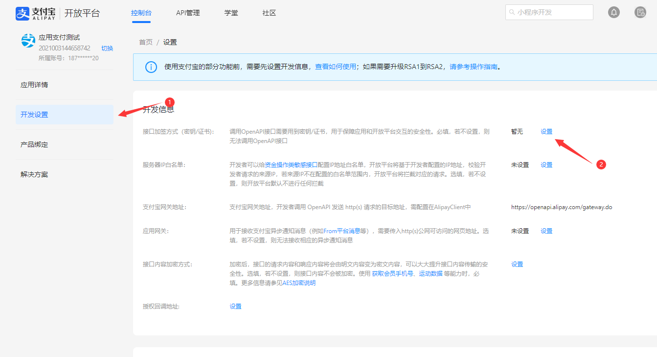 3.3、点击开发设置并选择接口加签方式设置,设置时需进行手机短信验证