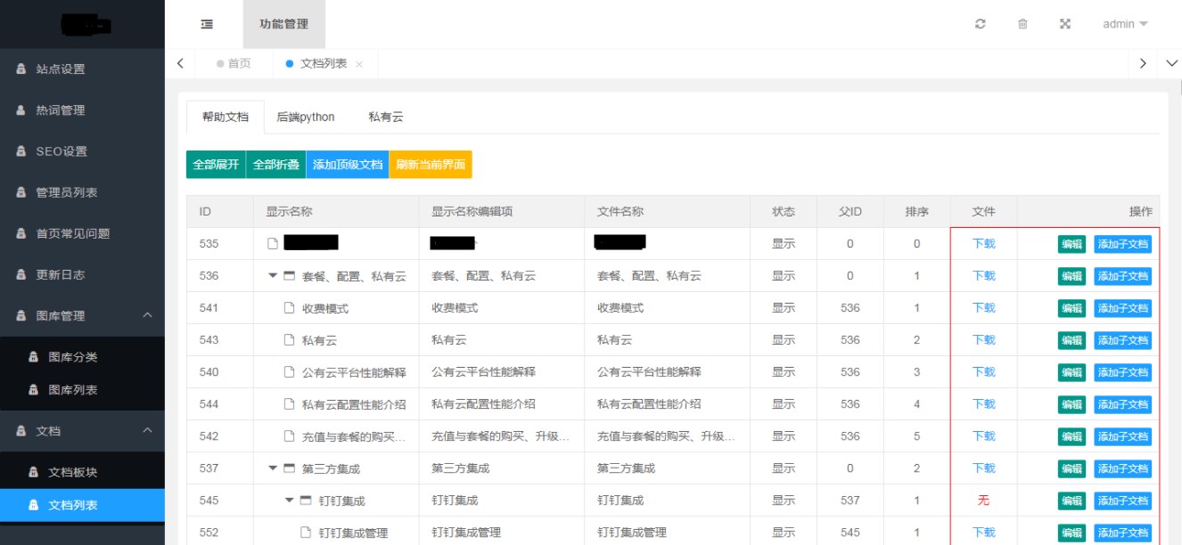 1. 点击添加顶级文档即可创建根目录文档,从根目录文档中添加子文档即可往下扩展子目录文档。