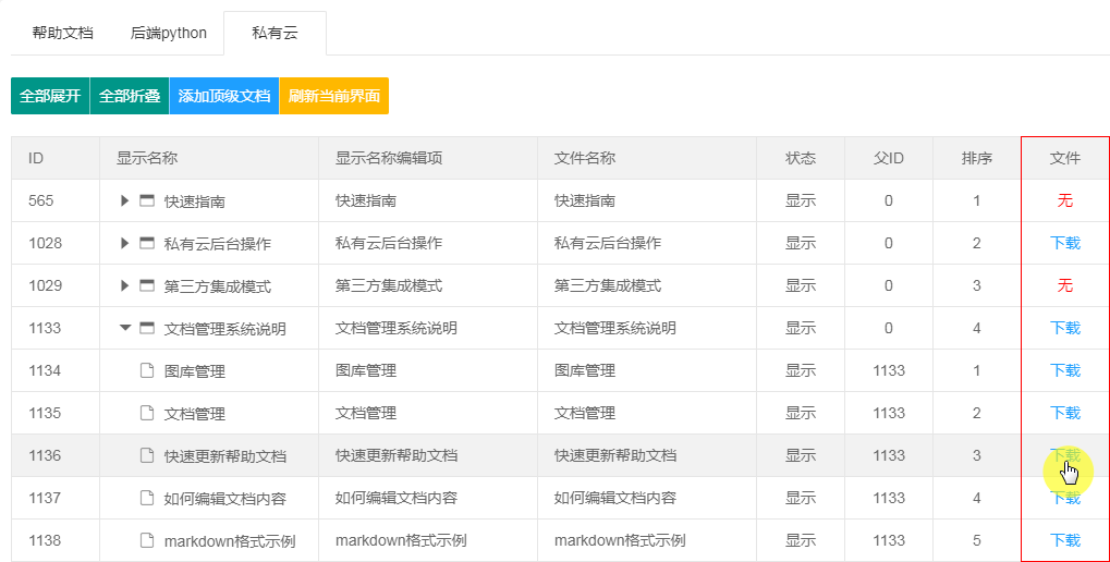 如图所示,在文档列表管理页面选择需要更新的板块,查看文档目录。