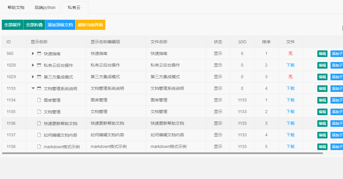 添加子文档:添加下级子文档目录。