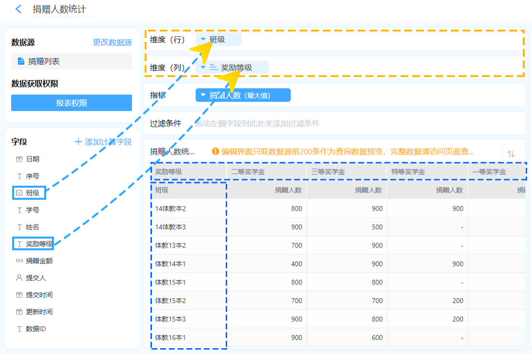 对于透视图也可以设置当前数据表是否显示序号、汇总标题对齐方式。如在姓名前面设置显示序号,同时将捐赠人数按照降序展示,即可得到不同班级的学生捐赠人数排名。