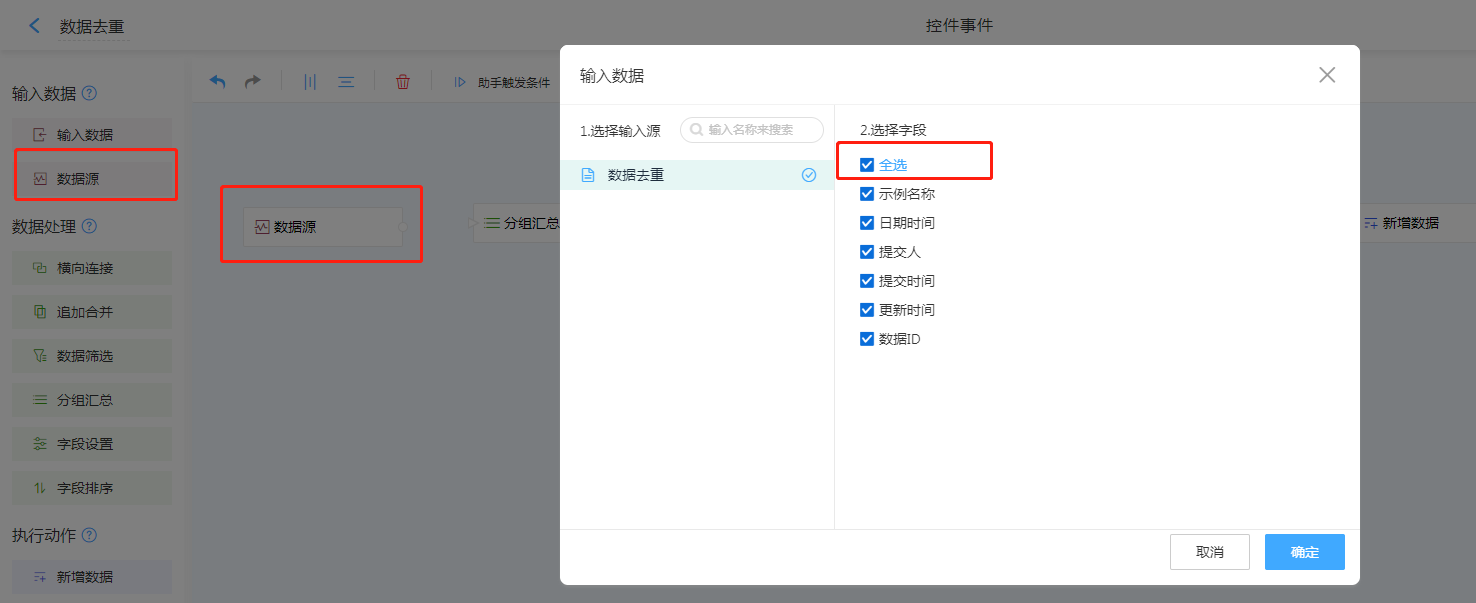 - 例如:本案例需要根据示例名称与日期时间进行去重(既全字段去重),那么需要将两个字段加入分组字段,并在计算字段值加入数据ID。