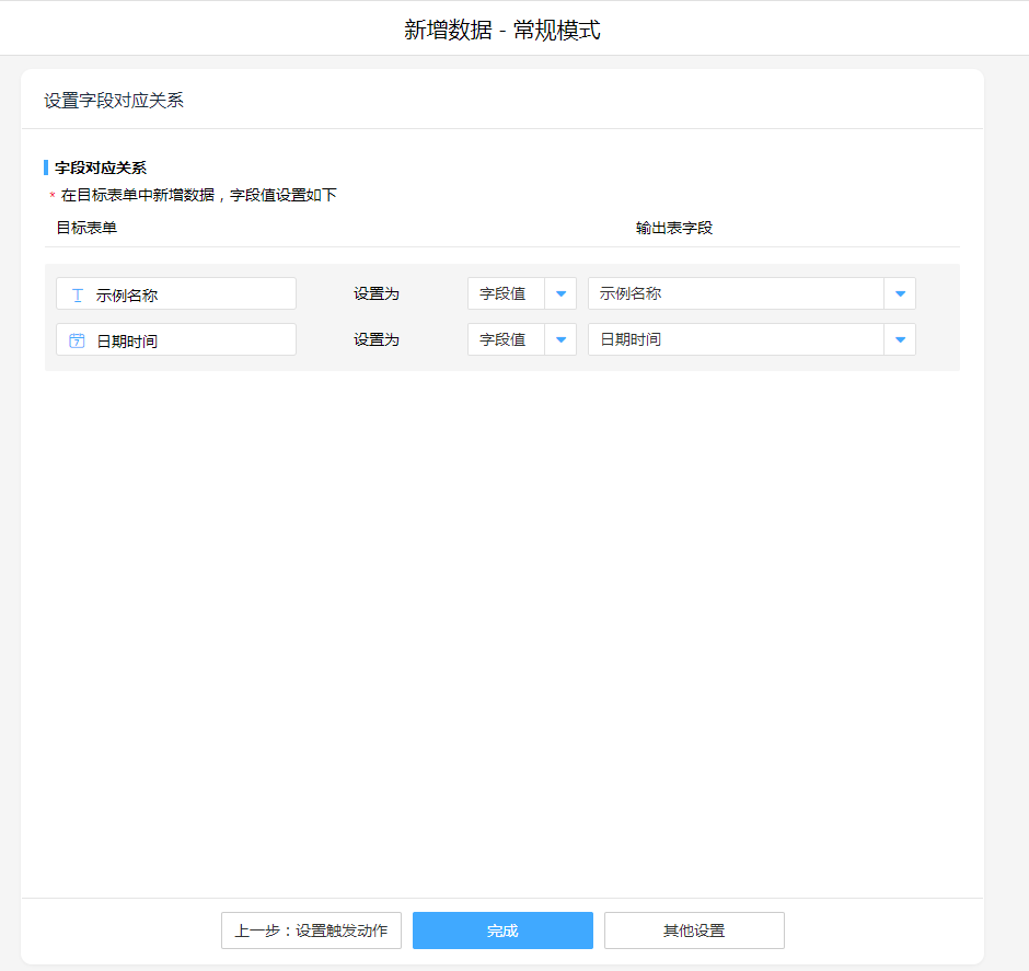 6.执行去重数据新增,添加执行动作新增数据,将所有字段与数据表中对应上,如发现字段缺失,请检查【步骤3】是否将所有字段加入分组字段或者计算字段。