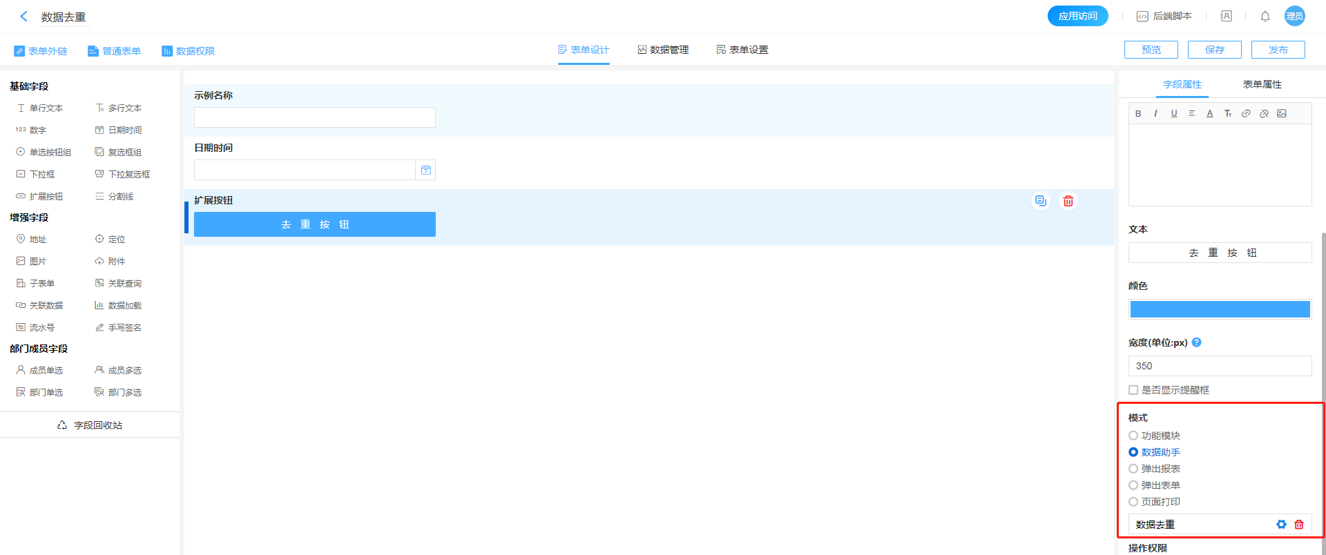 通过对控件或者计划任务进行数据助手配置,实现利用数据助手根据设置字段对表单进行去重操作。