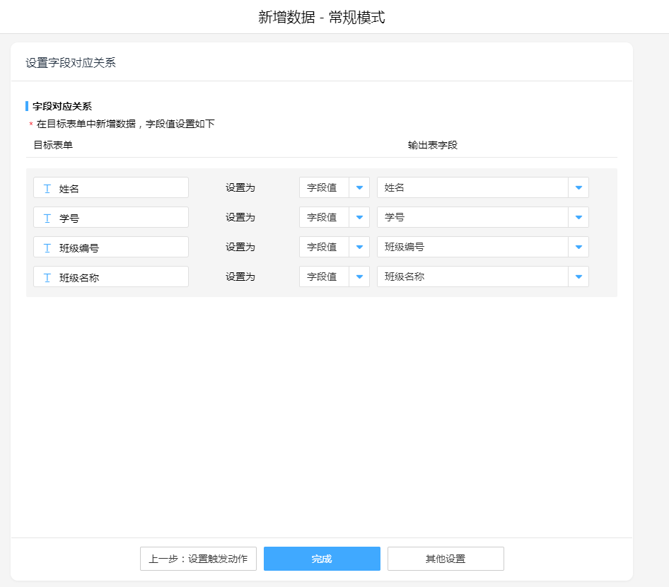 新增数据,将目标表字段与合并表字段进行对应。