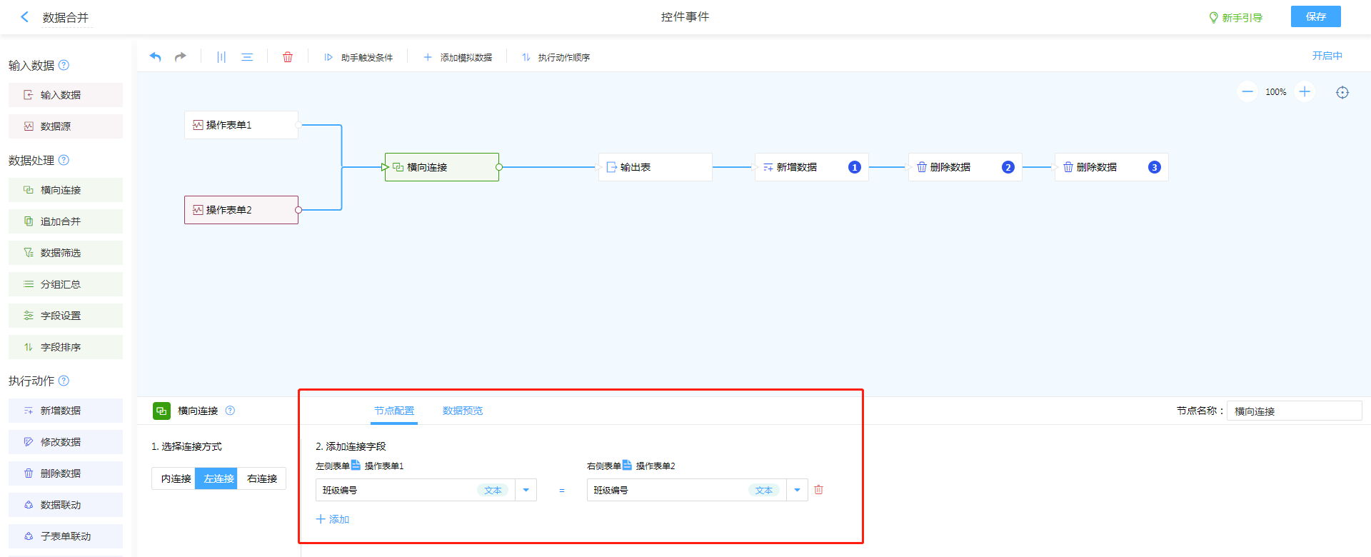 - 新增横向连接,设置主表与副表的关联字段,讲两表数据进行合并。