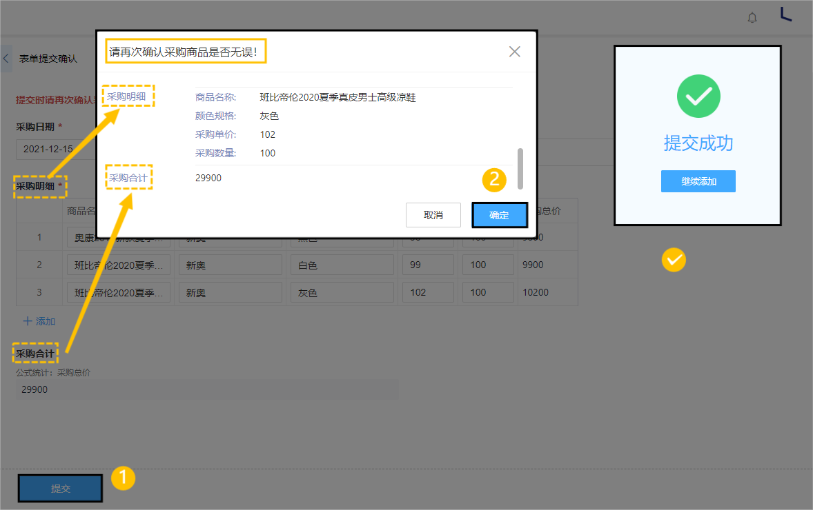 表单可以用于问卷调查、故障报修、自助下单等多种业务场景,但是一般提交人提交后显示的都是同一提示——“提交成功”。但是通过表单提交确认设置,您可以在表单提交前弹出确认对话框进行确认提示,对操作结果而言可以: