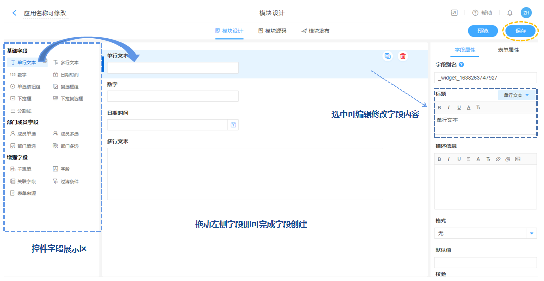 插件设计是添加相应的字段,设置标题等字段属性,直接将左侧导航栏中需要的的字段拖拽到设置区即可,选中在右侧可进行文本数字修改。设置完成后点击保存就能在【我的插件】中找到我们设计好的应用插件。