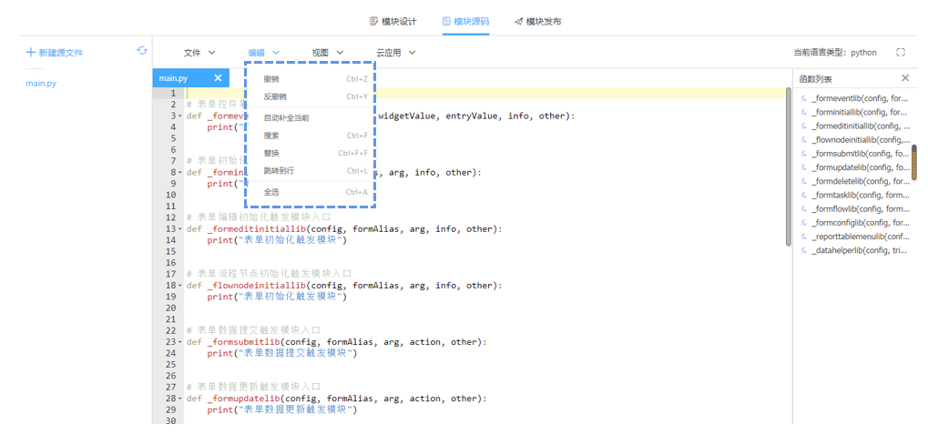 诚然,功能插件通过python封装而来,如果想进一步优化应用云翼运维也给与了代码在线编辑的权限。选中【插件源码】,编辑菜单中包含了一些常用功能并备注了快捷键,有代码基础的用户可以实现在线调试编辑代码。
