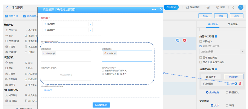 插件设置中可以选择预先在表单中设置好要发送具体文字,批量勾选部门及具体人员,响应条件可以选择活动类型,如:表彰大会,那么所有活动类型标注为表彰大会的成员都将收到消息提醒。