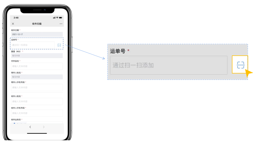 在云翼运维移动端后台找到物流派件跟踪系统,进入扫描表单中就能看到运单号的右侧有扫描提示。