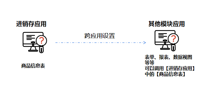 假设我们需要将进销存应用中的商品信息表、库存输出、库存表单设置为跨应用