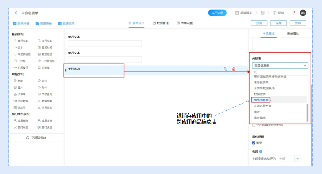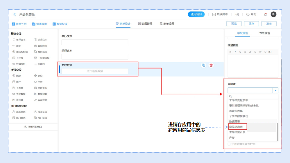 例如:在任意应用中调取进销存应用的跨应用聚合表数据信息。
