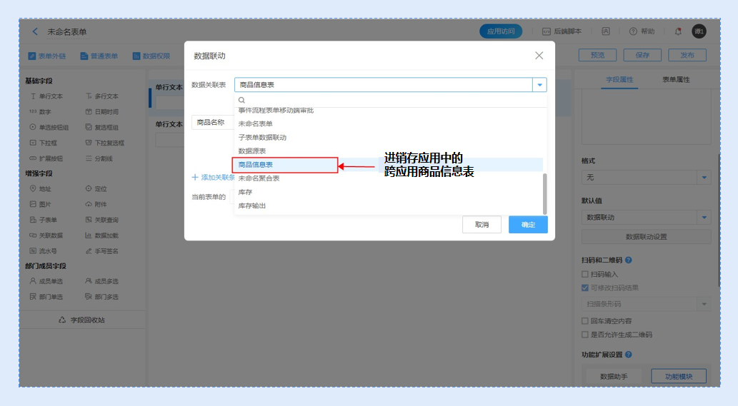 设置完成后,假设在任意应用中需要调用进销存应用中的跨应用表单,该如何操作呢?
