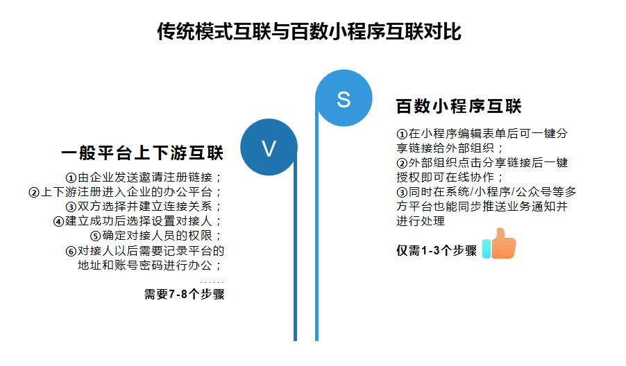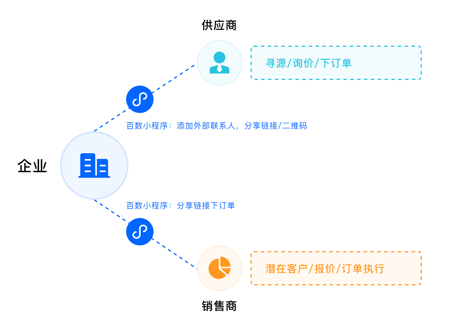云翼运维在电商领域具备丰富的项目经验,基于供应链上下游协同的应用需求,建立以企业为核心的上下游垂直一体化产业链布局,解决了多家企业供应链协同的难题。一般平台的上下游互联,企业与企业之间的连接过程需要跳转7-8个步骤,操作较为复杂。如果需要链接平台外的企业,还需要借助excel导入外部通讯录进行联系人设置,达不到便捷互联协作的效果,而利用云翼运维小程序只需要1-3个步骤就可以轻松实现一键互联。