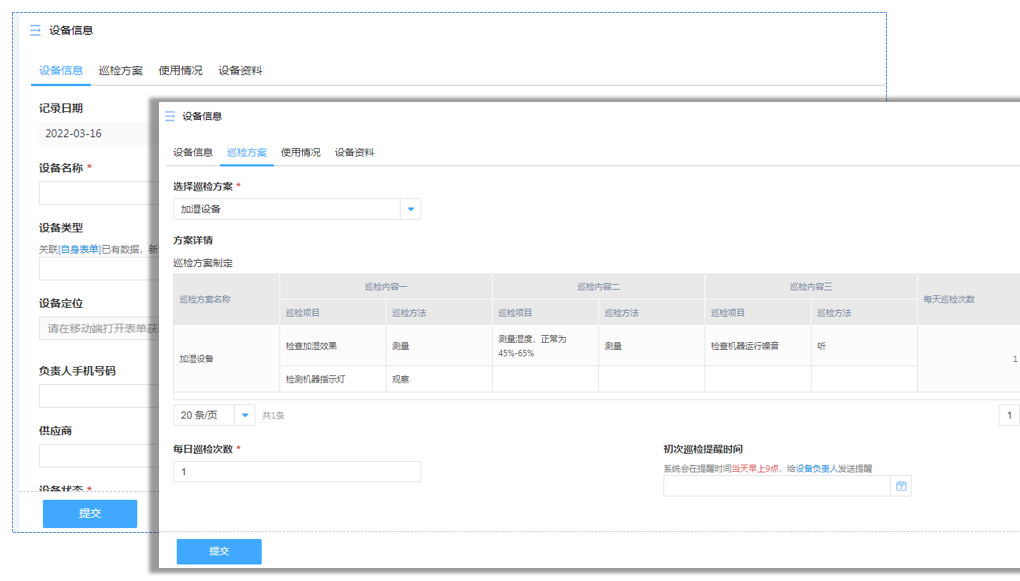 借助云翼运维子表单功能可以同时录入或调阅与设备信息相关的多个表单内容,例如切换巡检方案表单可以确认巡检指标,减少检查纰漏。