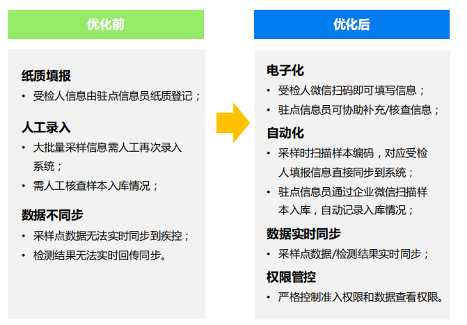 整套系统基于企业微信组织架构,可对组织架构进行管理,人员的调度实现高效管理;改变原先需手动、多次录入信息的方式,通过企业微信快速收集受检人信息,并实现自动核验、分区统计。