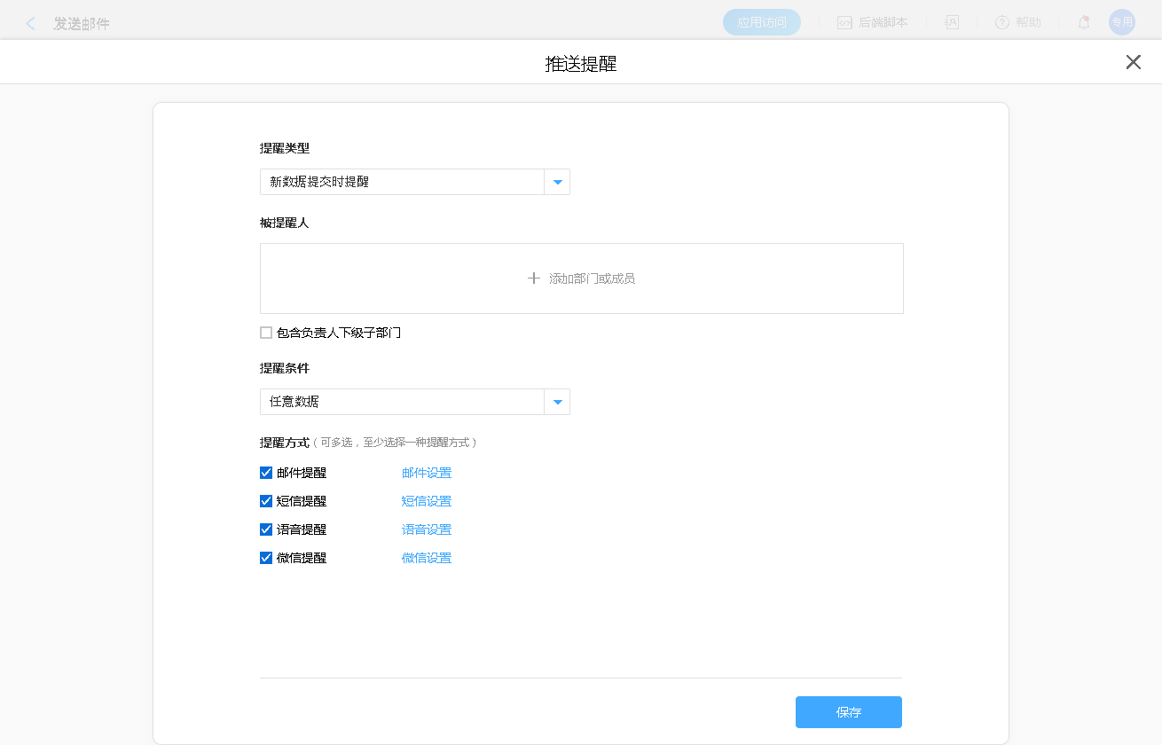 “微信提醒”可将需要的内容直接通过微信推送给对应的接收人。