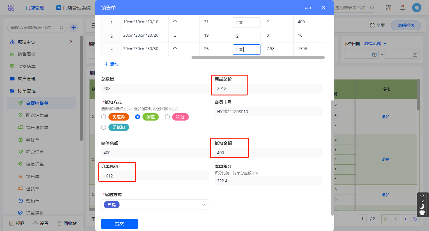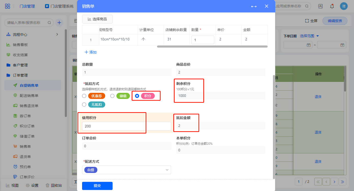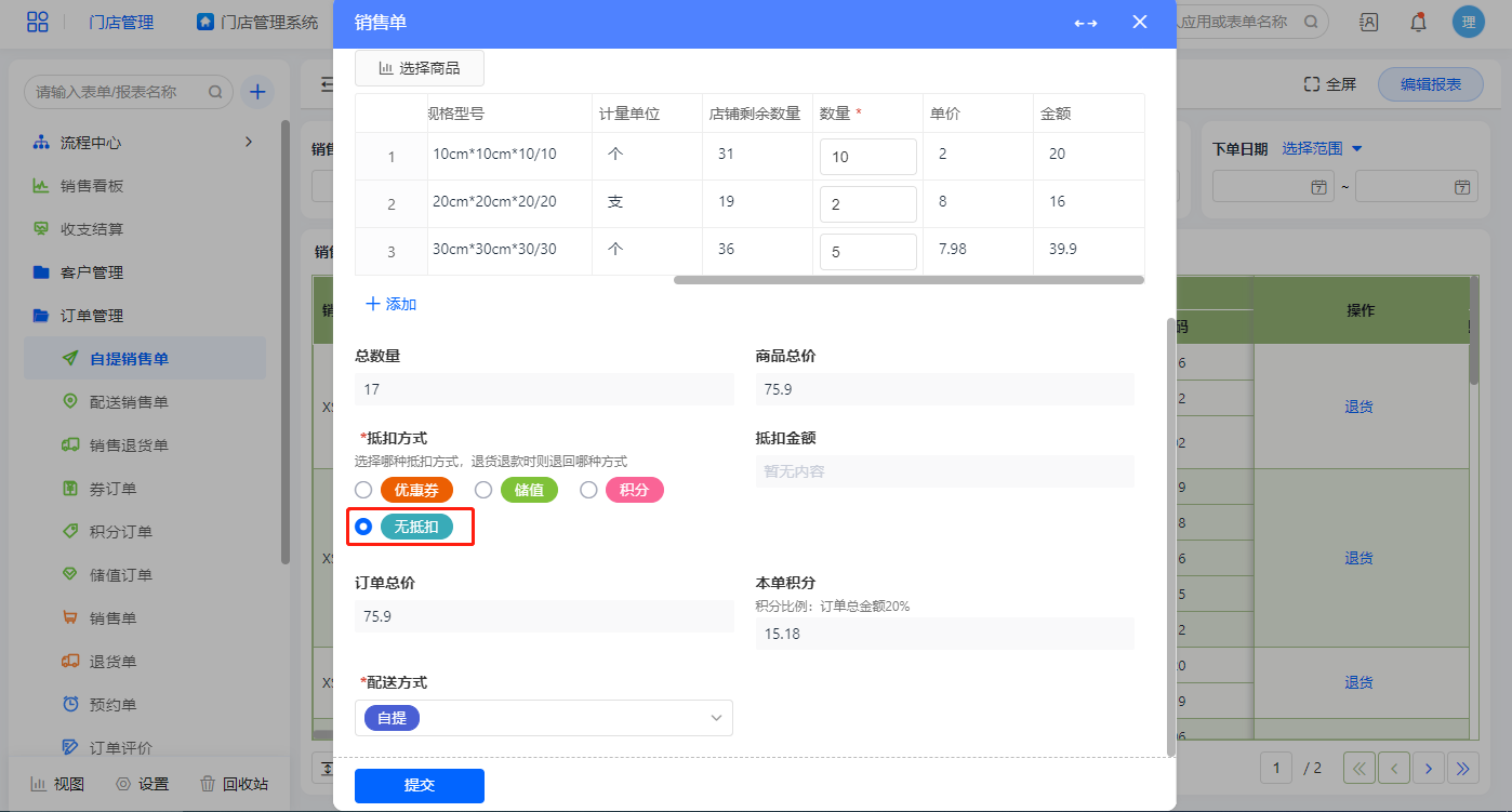 点击新增订单弹出销售单报表,配送方式默认为自提,配送方式为自提提交表单后直接结束流程;抵扣方式默认为不抵扣,订单总价则直接是商品总价,积分为订单总价的20%;