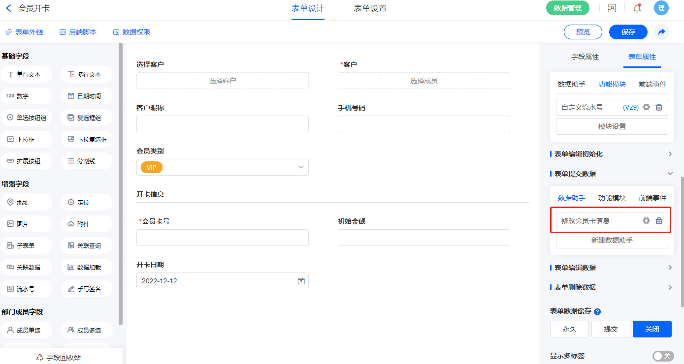 提交会员开卡表单之后,由数据助手更新该客户的会员卡信息至客户信息表单;