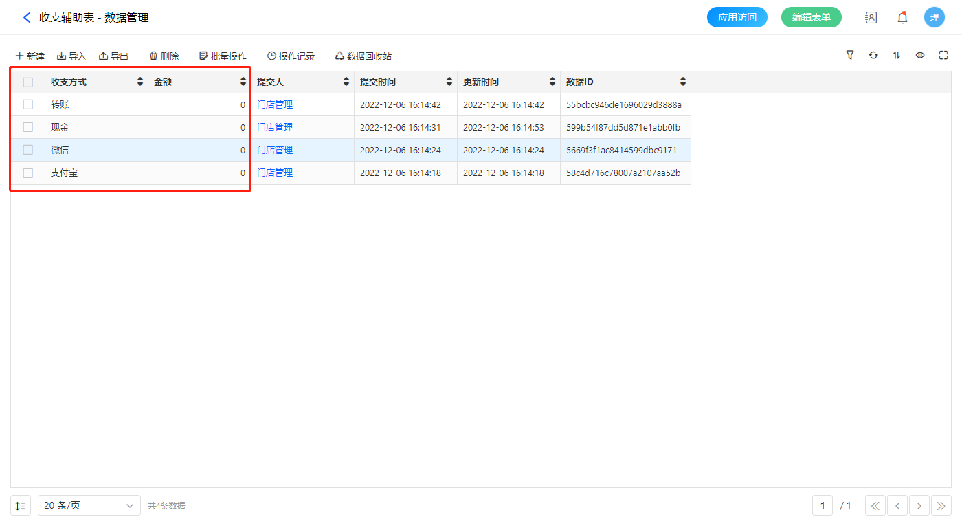 收支辅助表里的数据固定不更改,该表用于收支结算的数据视图,便于计算出收支方式的总金额,防止某一收支方式空缺时金额统计不完整的情况;数据视图的数据在收支结算报表展示;