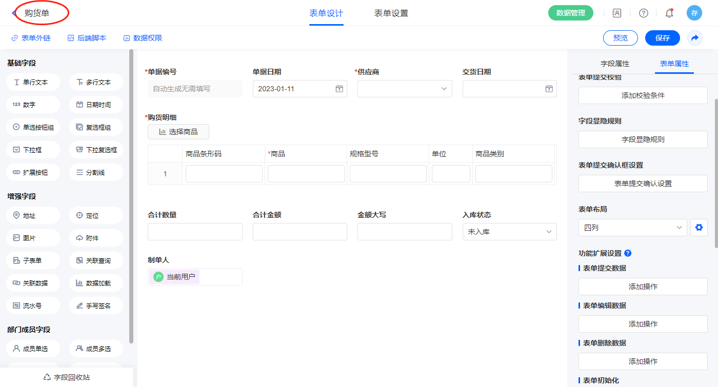 2.2、表单【购货单】字段及表单属性设置