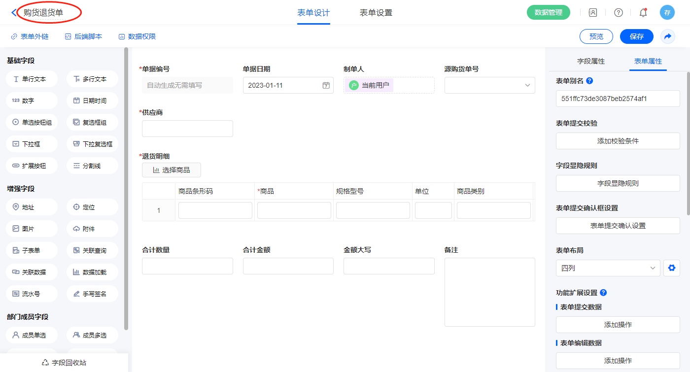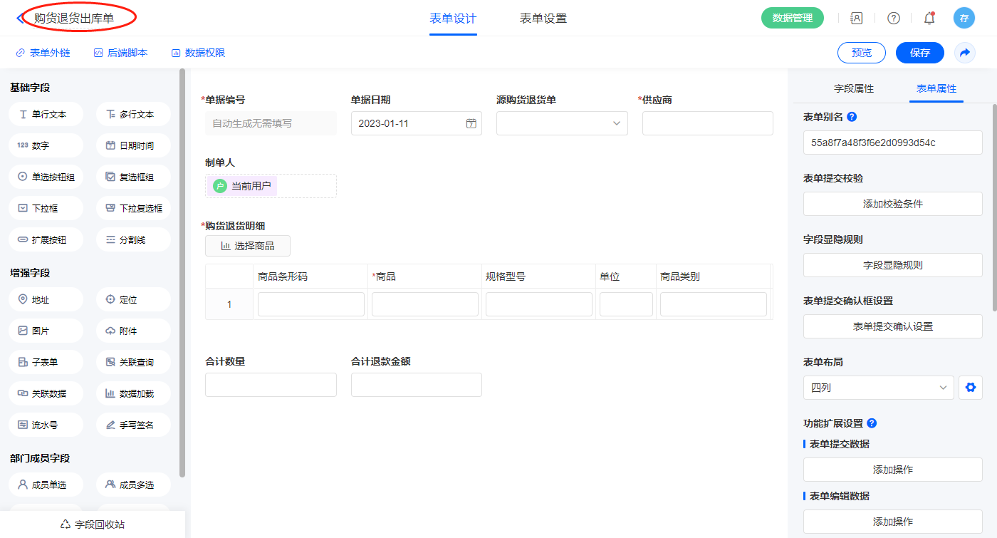 2.3、表单【购货退货单】字段及表单属性设置