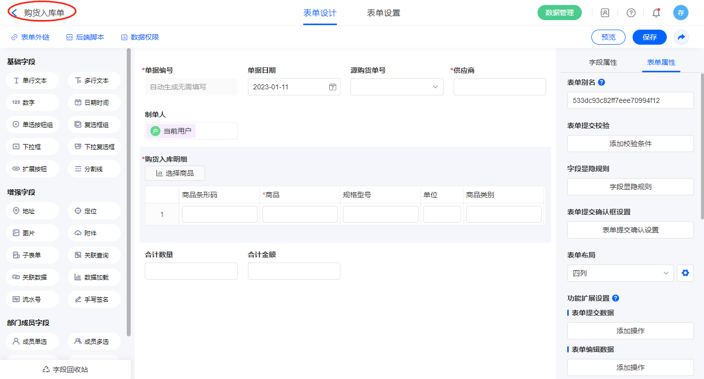 2.4、表单【购货入库单】字段及表单属性设置