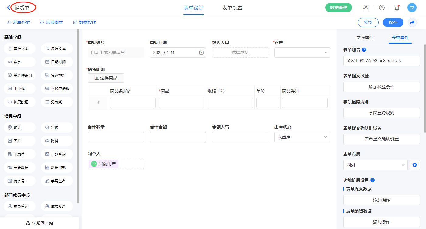 2.6、表单【销货单】字段及表单属性设置