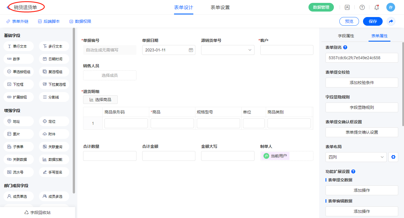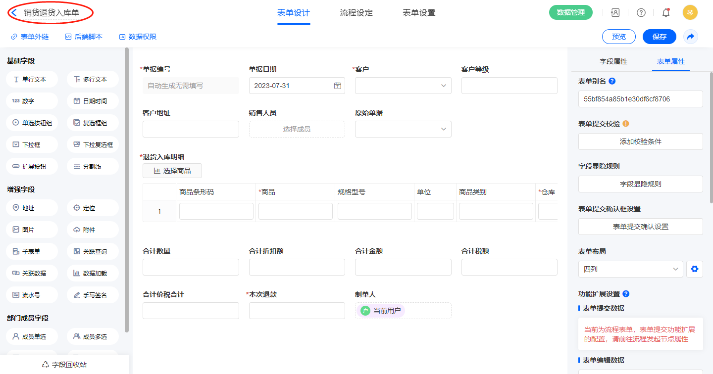 2.7、表单【销货退货单】字段及表单属性设置