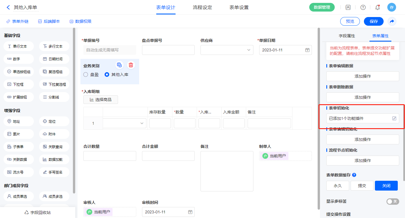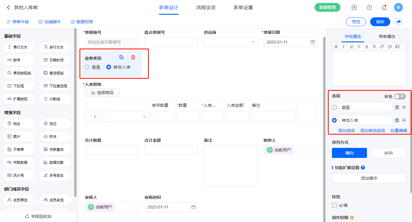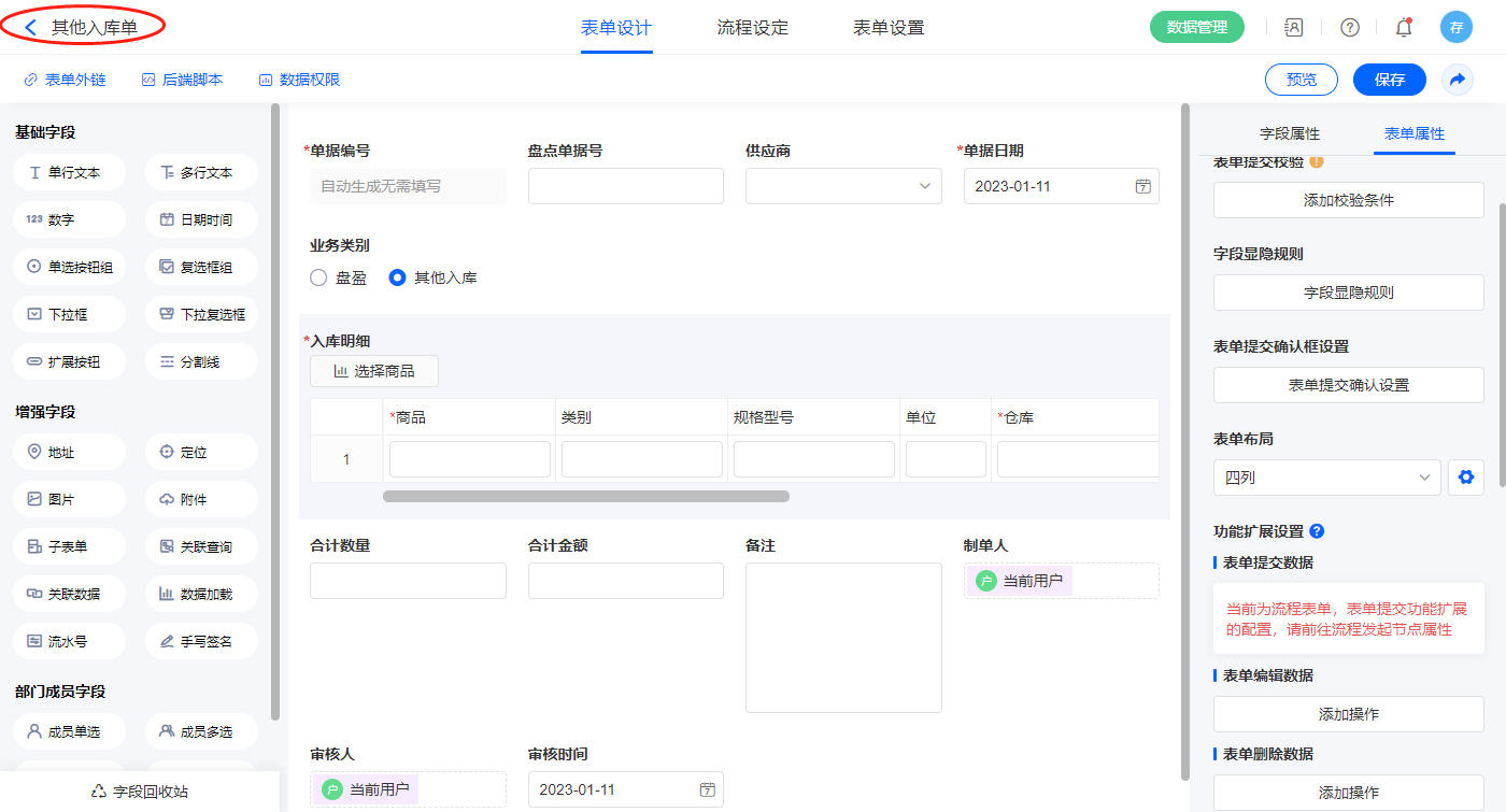 2.12、表单【其他入库单】字段及表单属性设置