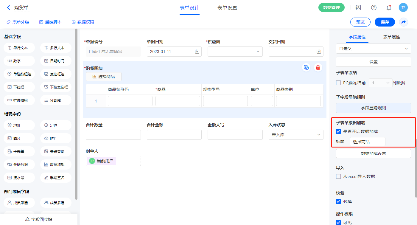 1)选中【购货明细】字段,开启子表单数据加载;