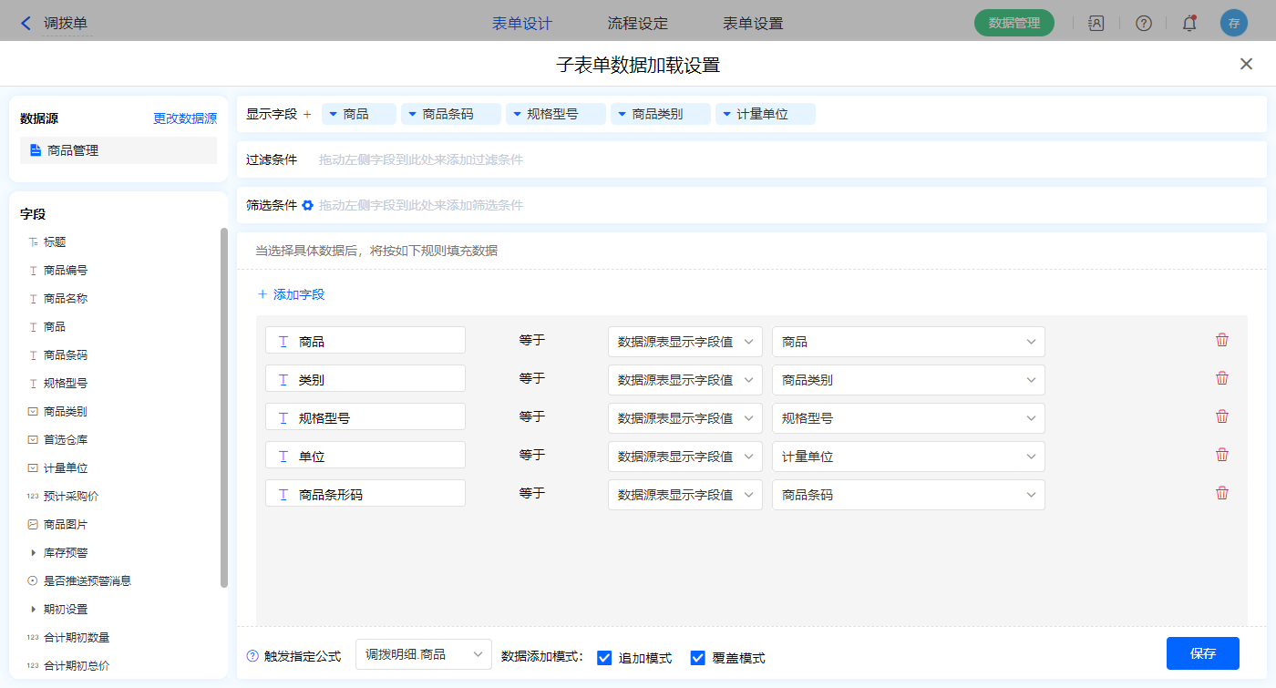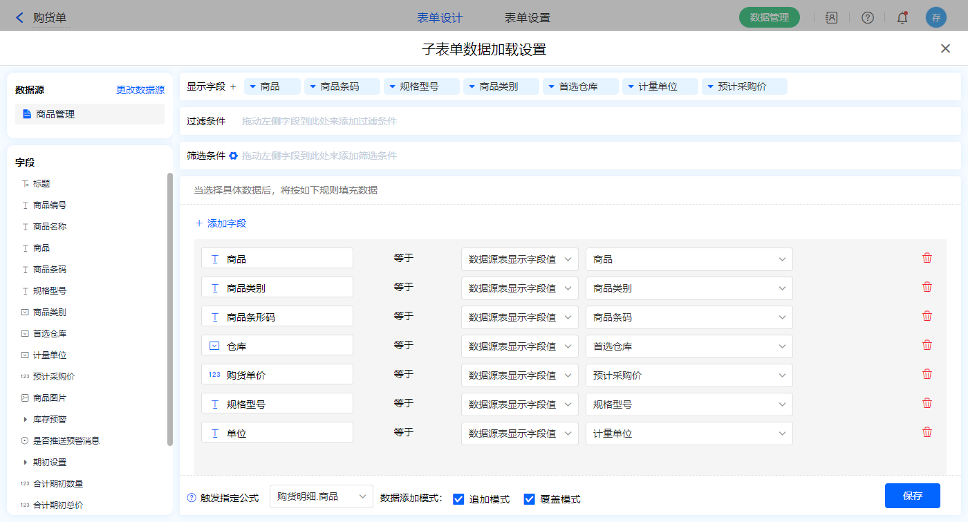 数据源为【商品管理】,添加过滤条件及设置赋值字段,触发公式为【商品】字段;