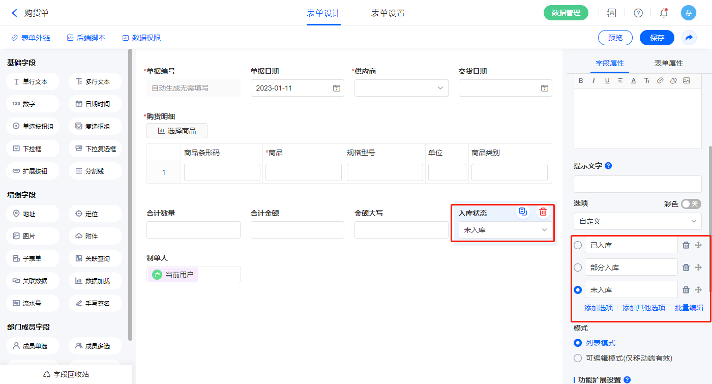 2)选择【入库状态】字段,输入下拉框选择,并设置默认值为未入库;