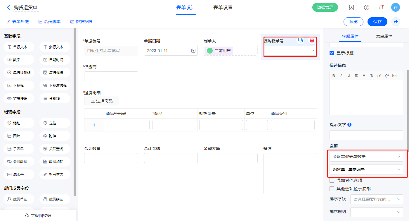 1)【源购货单号】字段,选择设置为关联其他表单数据,关联购货单的【单据编号】字段;