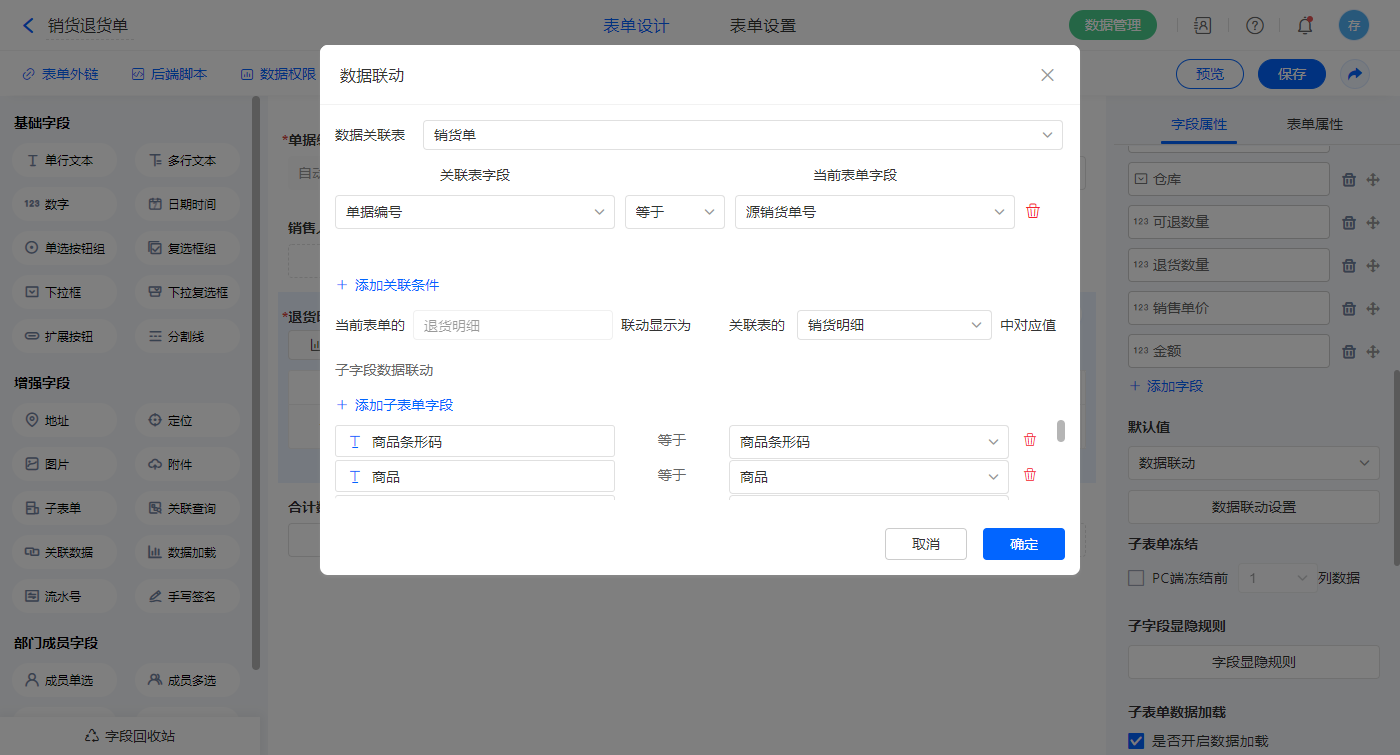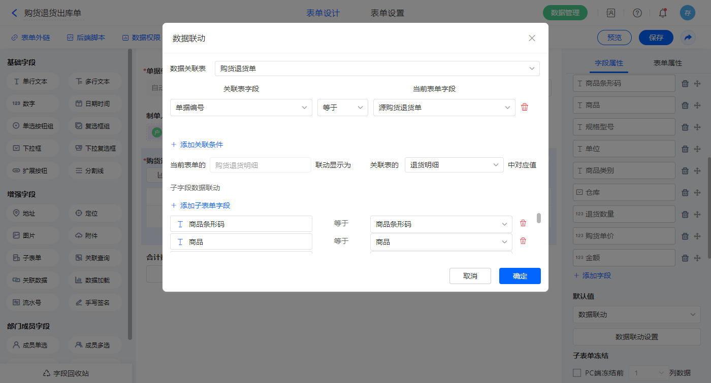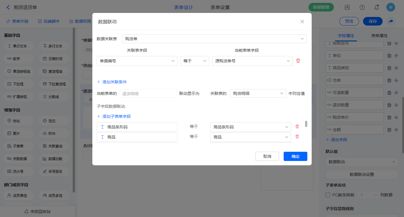 2)选中【退货明细】字段,默认值选择数据联动,设置联动条件及对应字段;