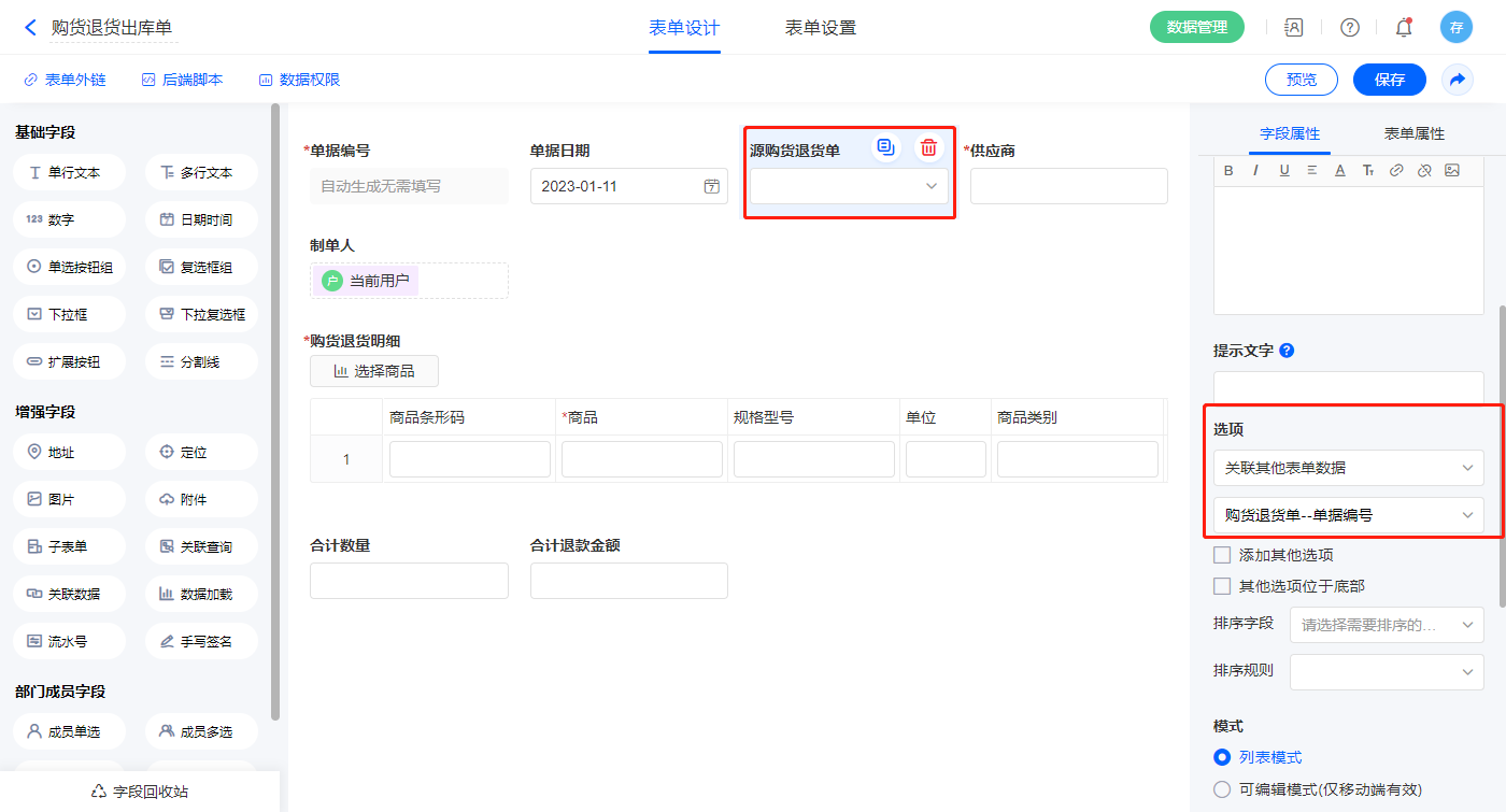 1)【源购货退货单号】字段,选择设置为关联其他表单数据,关联购货退货单的【单据编号】字段;