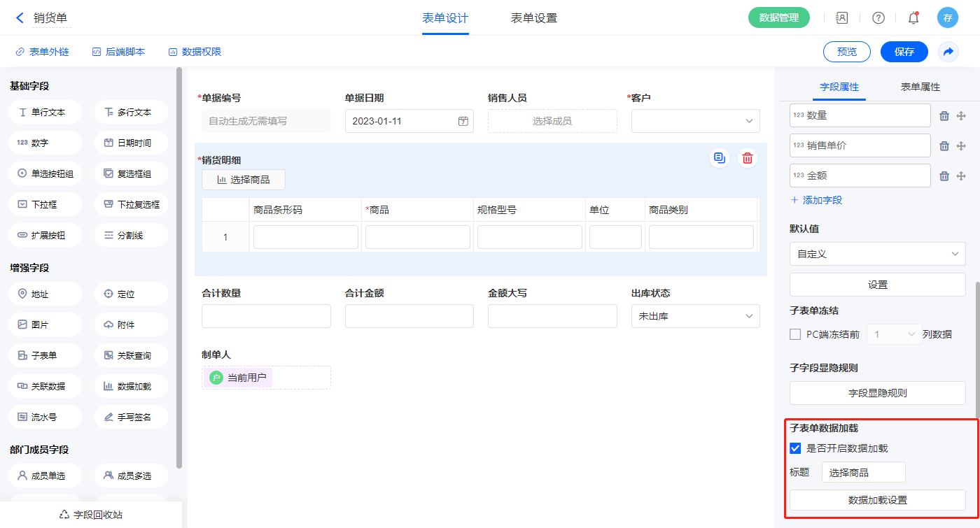 1)选中【销货明细】字段,开启子表单数据加载;