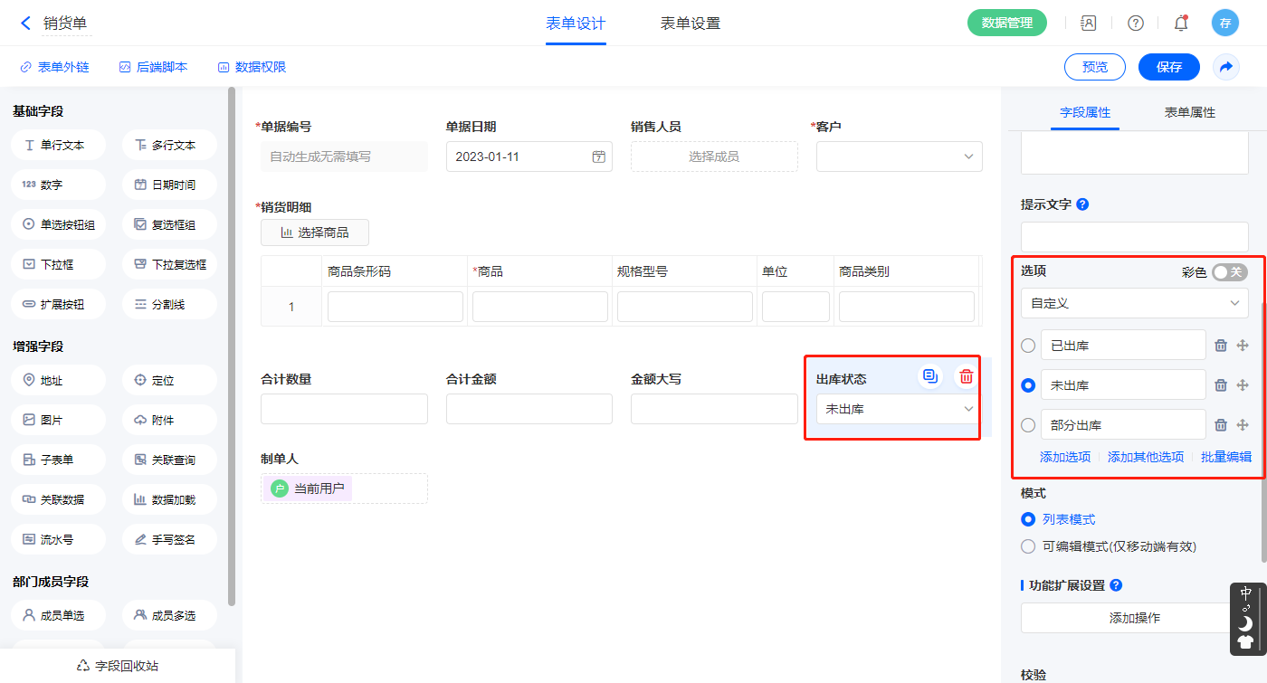 2)选择【出库状态】字段,输入下拉框选择,并设置默认值为未出库;
