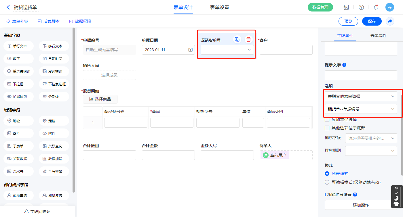 1)【源销货单号】字段,选择设置为关联其他表单数据,关联销货单的【单据编号】字段;