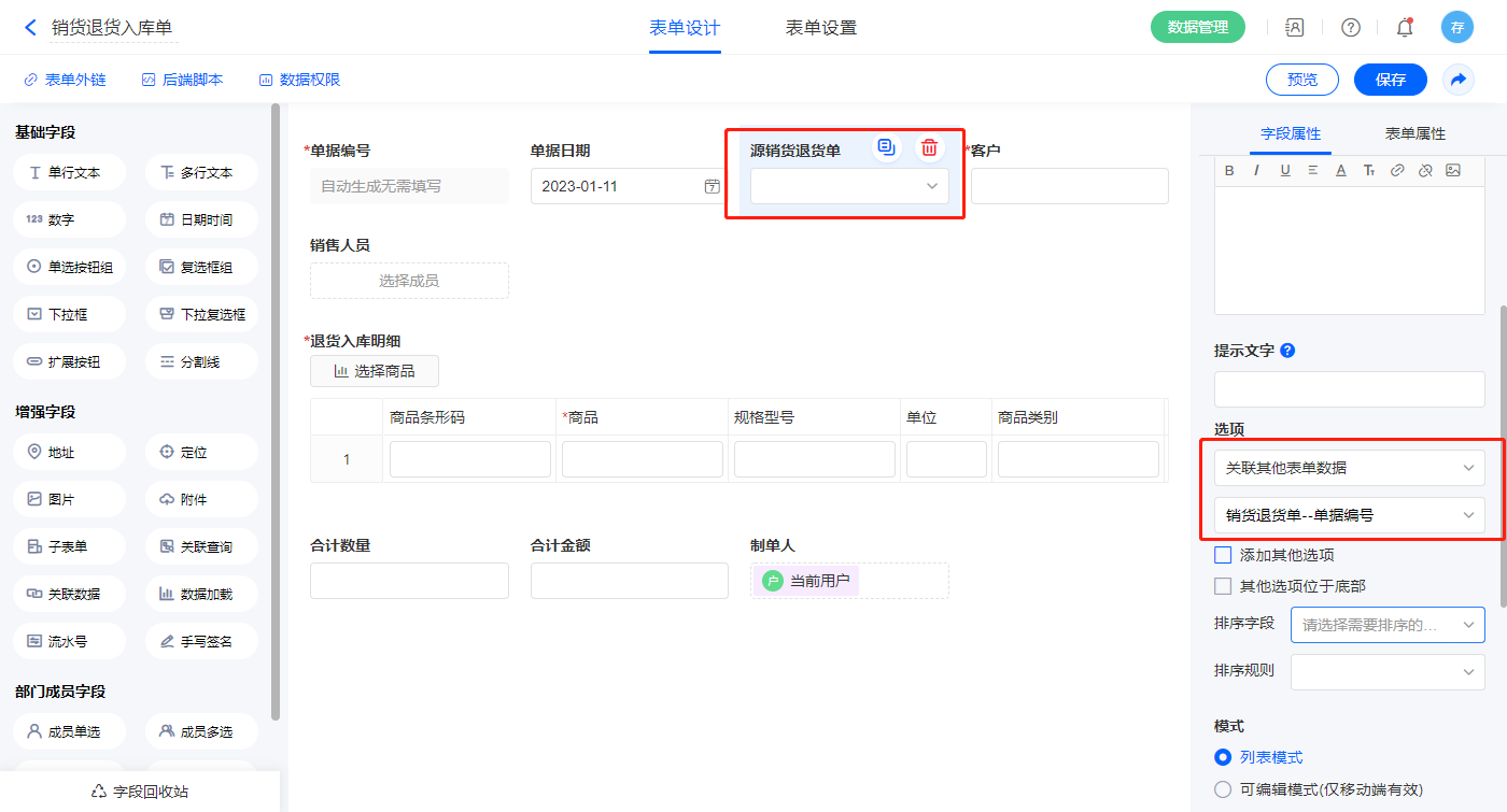 1)【源销货退货单】字段,选择设置为关联其他表单数据,关联销货退货单的【单据编号】字段;