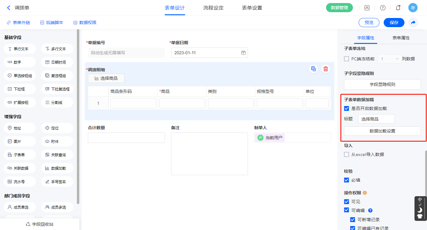 1)选中【调拨明细】字段,开启子表单数据加载;