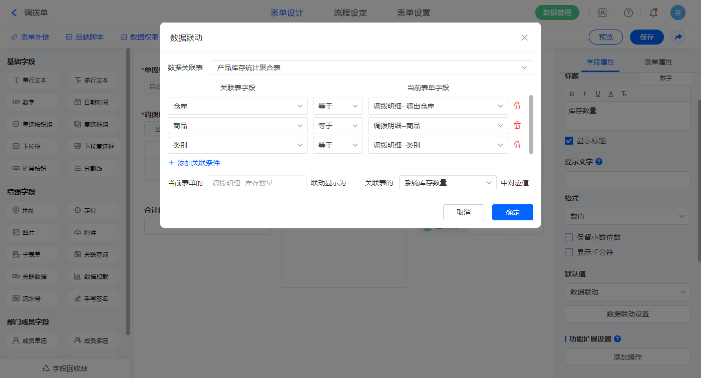 2)选中【调拨明细.库存数量】字段,默认值选择数据联动,设置联动条件及对应字段;