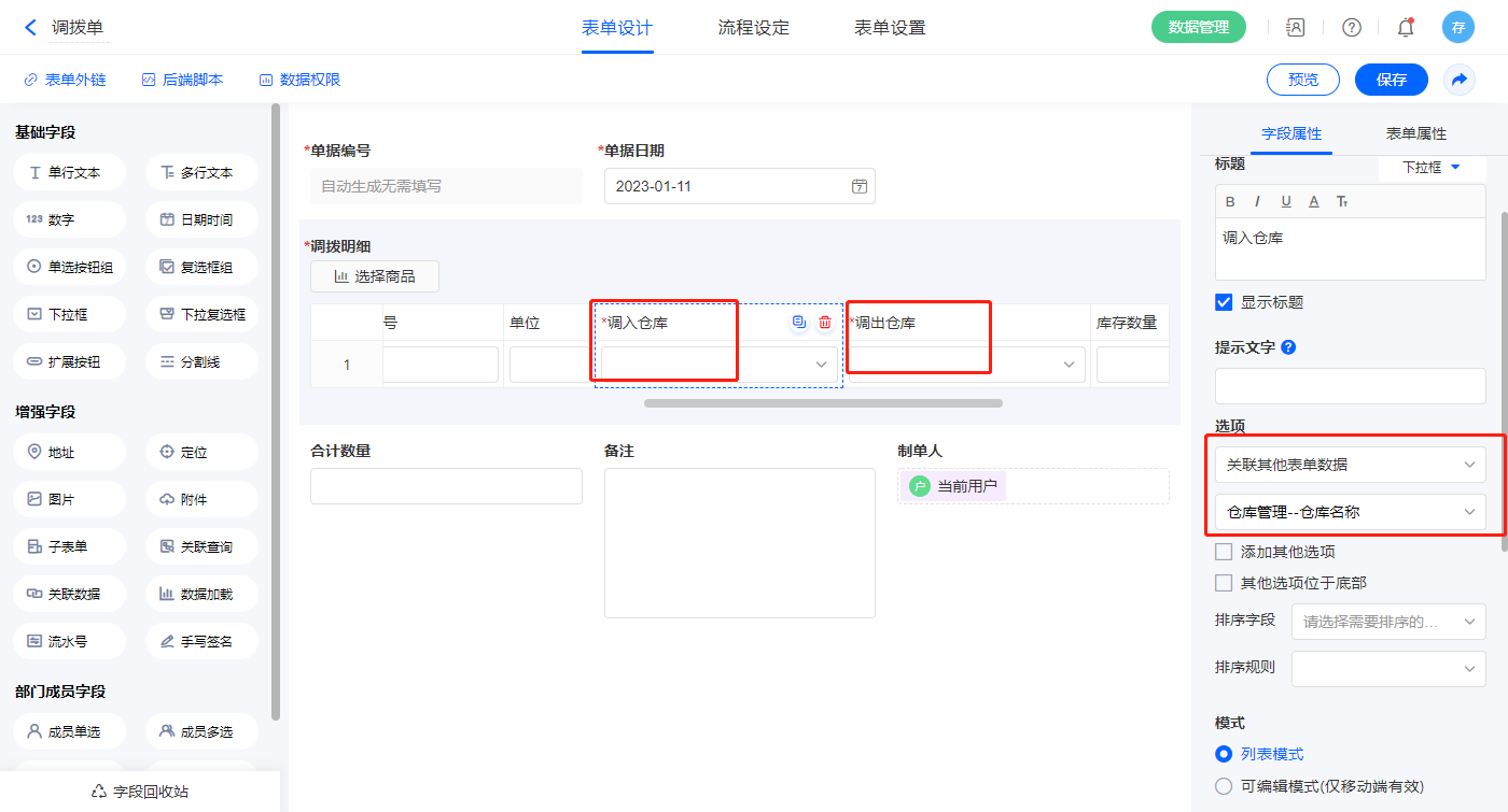 3)【调拨明细.调入仓库】、【调拨明细.调出仓库】字段,选择设置为关联其他表单数据,关联仓库管理的【仓库名称】字段;