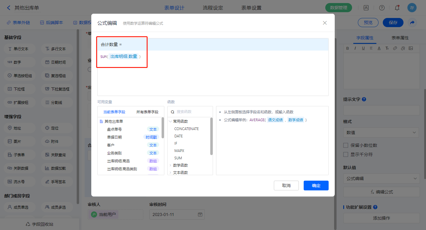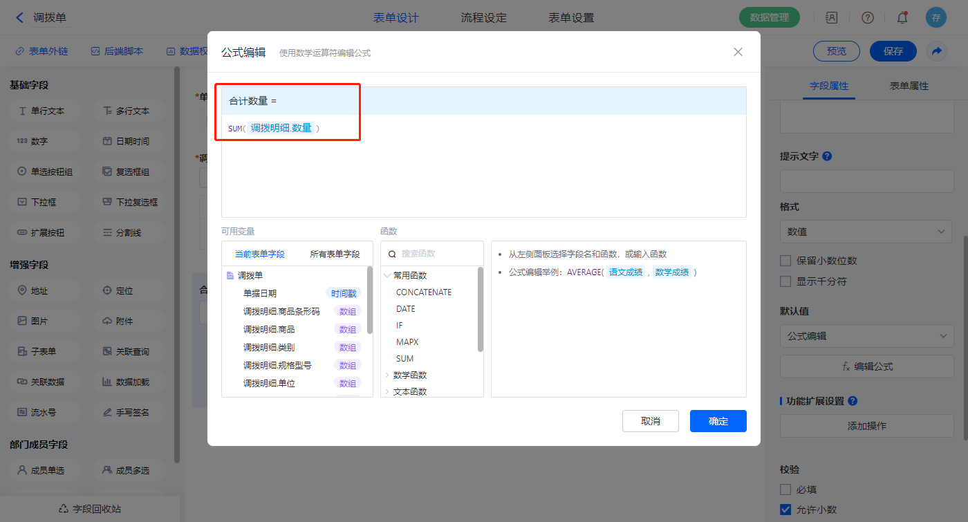 【合计数量】字段默认值设置为公式编辑,如图设置公式;